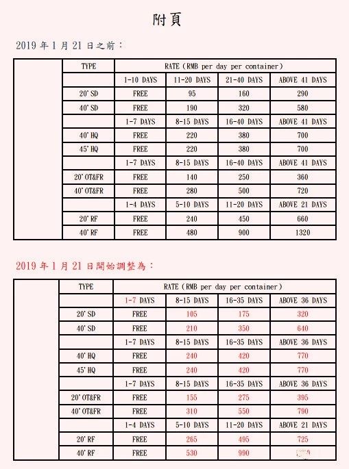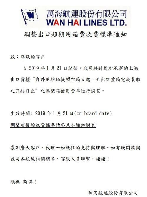 自2019年1月21日開始,將針對(duì)所承運(yùn)的上海出口貨柜“自外圍堆場(chǎng)提領(lǐng)空箱日起,至出口重箱完成裝船之開船日止”之集裝箱使用費(fèi)率進(jìn)行調(diào)整。